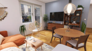 Wnętrze z naturalnymi materiałami, rattanowymi dodatkami i ciepłą kolorystyką. Salon sprzyja relaksowi i wspólnym chwilom w kameralnej, domowej atmosferze.