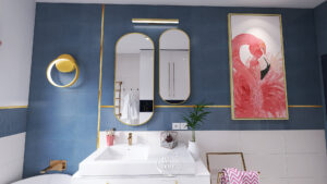 Wyrazista łazienka z granatowymi płytkami, złotymi detalami i obrazem flaminga. Połączenie elegancji z odważnym, artystycznym wyrazem.