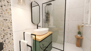 Minimalistyczna łazienka z przeszklonym prysznicem, owalnym lustrem i szafką z drewnianym blatem. Połączenie bieli, czerni i zieleni tworzy elegancki klimat.