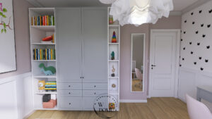 Jasny i funkcjonalny pokój dziecięcy z zabudową na książki i zabawki, biurkiem do nauki i subtelnymi dekoracjami w stylu skandynawskim