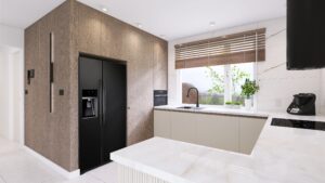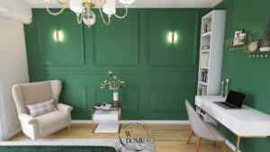 Stylowe biurko z biblioteczką na tle zielonej ściany. Elegancka przestrzeń łączy funkcjonalność z przytulnym miejscem do odpoczynku.