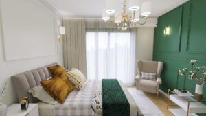 Sypialnia w stylu klasycznym z zieloną ścianą, złotymi dodatkami i miękkimi tkaninami. Przytulna, jasna przestrzeń sprzyjająca relaksowi i odpoczynkowi.