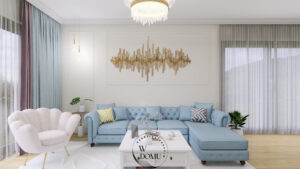 Elegancki salon z błękitną sofą, złotymi detalami i dużą ilością naturalnego światła. Przestrzeń sprzyjająca relaksowi w stylu nowoczesnej klasyki.