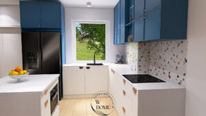 Kompaktowa kuchnia z niebieskimi szafkami, kolorowym terrazzo i dużym oknem. Funkcjonalna przestrzeń z energią i charakterem dzięki odważnym akcentom.